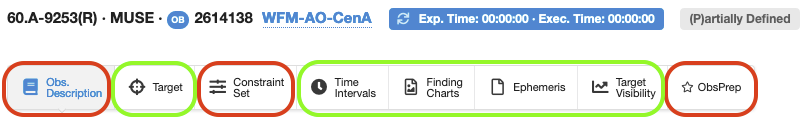 Your newly created OB consists of general (Target, Time Intervals, Finding Charts, Ephemeris, Target Visibility) and instrument specific (Obs. Description, Constraint Set and ObsPrep) sections that in the figure below are highlighted in red and green, respectively. Each section is accessible through the corresponding tab that appears just below the OB name.