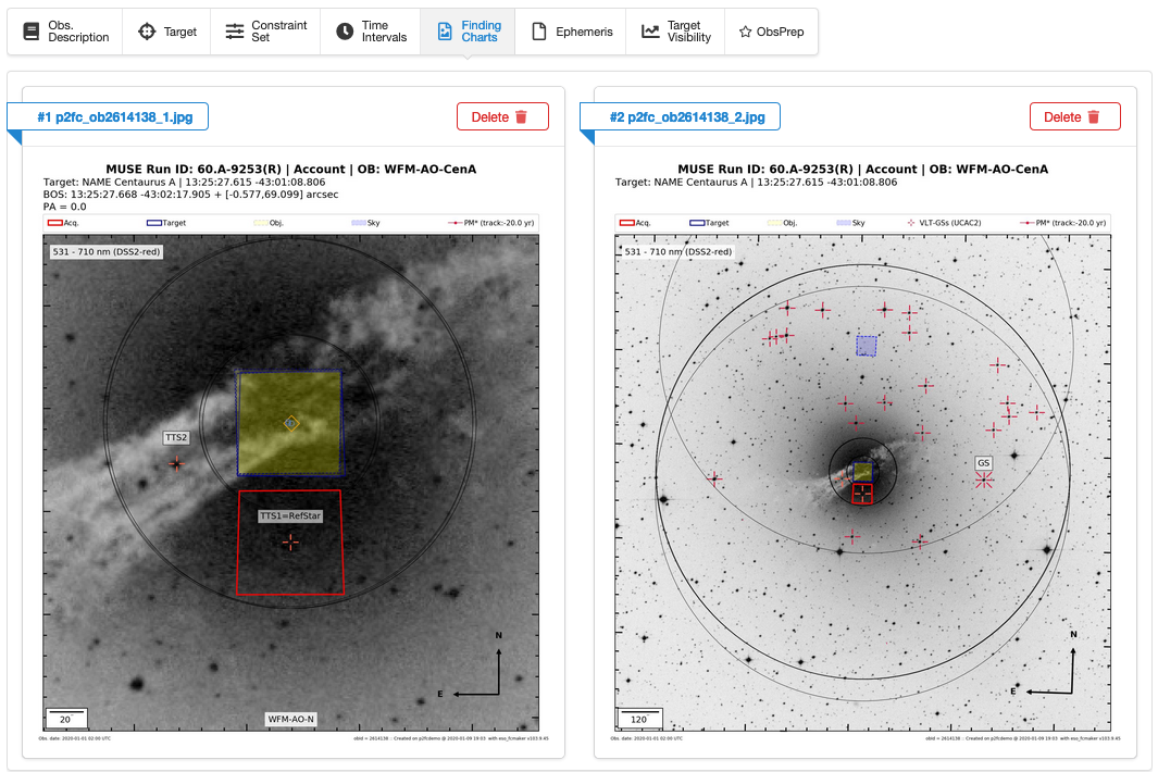 At this point you must create finding charts compliant with ESO general and MUSE specific requirements. The easiest and quickest way to do that is by using the finding charts generator embedded in the p2 environment. Once the OB templates content has been fully provided, click on the "Generate Finding Chart" button you find under the Finding Charts section. In doing that 2 finding charts will be created and automatically attached to the OBs. Specifically, the tool produces a finding chart showing the position of the selected VLT-GS with respect to the telescope pointing (i.e., large field of view chart showing the telescope patrol field), and a second one showing the MUSE FoV footprint centred on the reference star selected for the accurate target centering onto the target field showing the final centering.