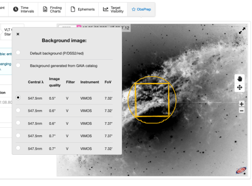 Screenshot of the ObsPrep-Pointing GUI after having changed the backgroud image from DSS (default) to the available VIMOS images.