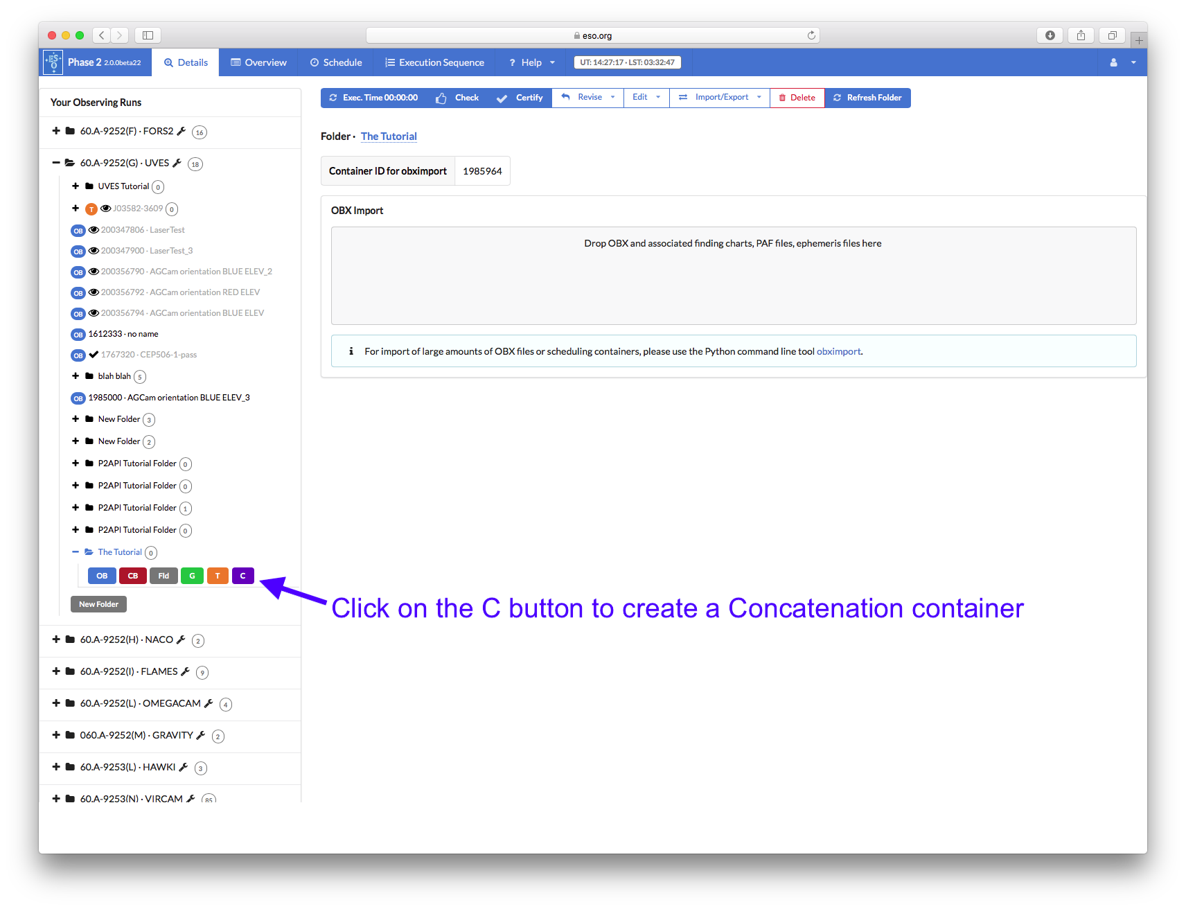 You can now start creating your OBs. Since we want our two OBs to be executed in sequence, we must define them inside a Concatenation container. Open the new folder you created by clicking on the + icon next to it and then click on the purple C icon to create a Concatenation container.
