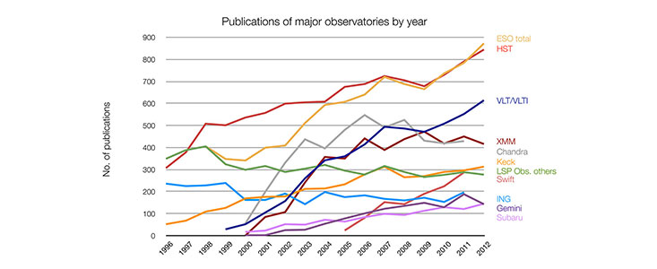 Die Methoden zur Ermittlung dieser Zahlen variieren bei unterschiedlichen Observatorien, so dass die Graphiken nicht immer genau vergleichbar sind. Trotzdem hat die ESO jedes andere bodengebundene Observatorium signifikant übertroffen und liefert sich seit sechs Jahren ein Kopf-an-Kopf-Rennen mit dem NASA/ESO Hubble Space Telescope - Ergebnisse, die den Beitrag der ESO zu astronomischer Forschung deutlich festigen. Die veröffentlichten Statistiken geben einen Eindruck davon, wie viel wissenschaftliche Arbeit mit den Daten der unterschiedlichen Observatorien geleistet wird, zeigen aber nicht deren Auswirkungen Wissenschaft.