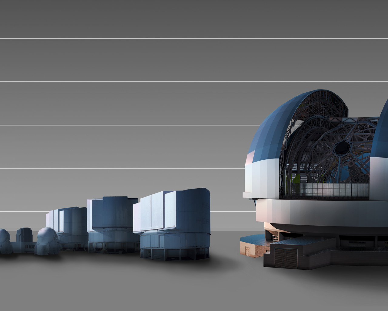 Diese künstlerische Darstellung vergleicht das E-ELT (rechts) mit dem VLT und anderen Teleskopen am nahe gelegenen Paranal-Observatorium der ESO in Chile.