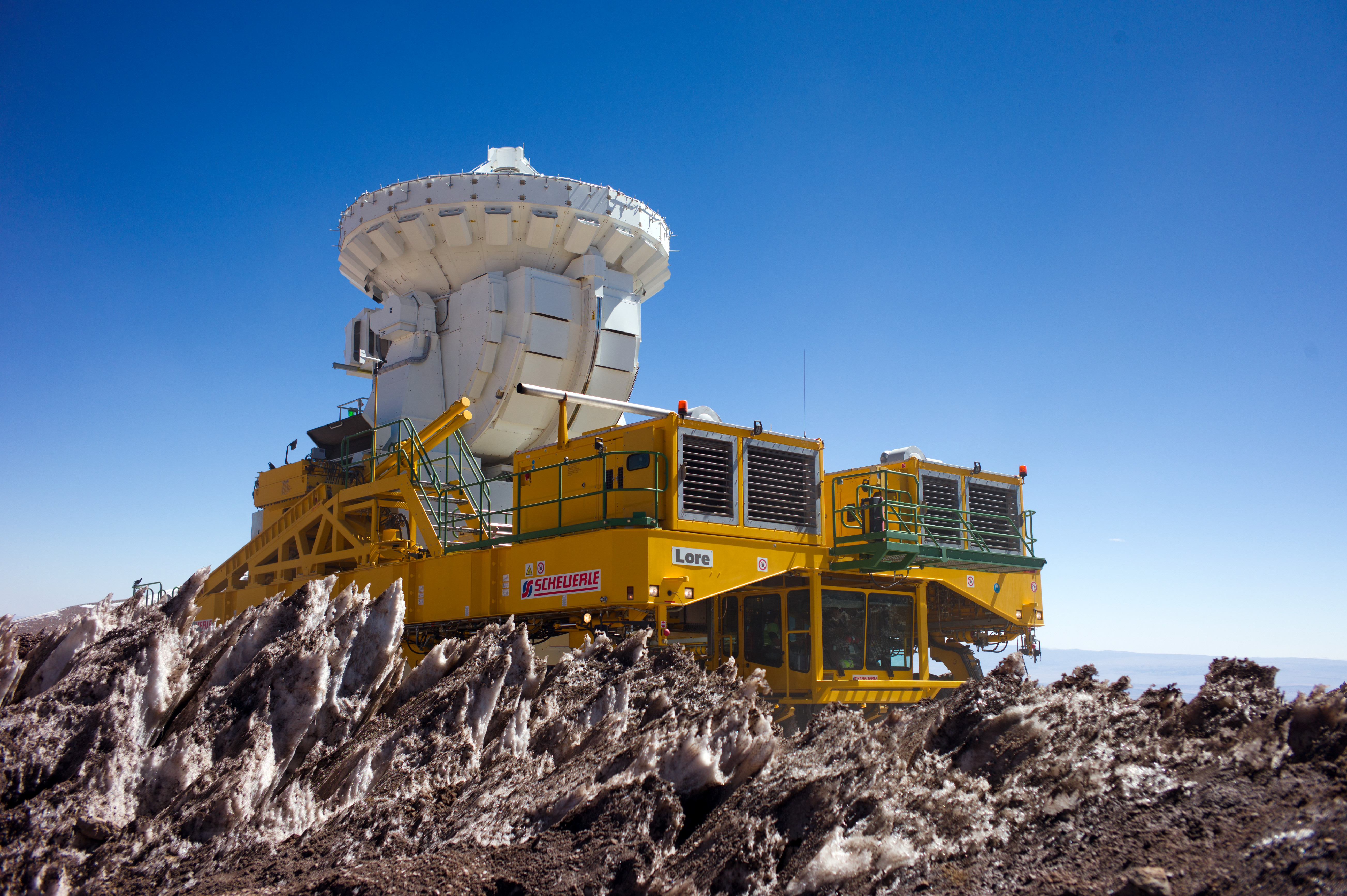 Dans cette photo, l'un des deux transporteurs ALMA, Lore, porte l'une des antennes de 7 mètres de diamètre d'ALMA, l'Atacama Large Millimeter/submillimeter Array. Lore et son jumeau, Otto, sont deux véhicules d'un jaune brillant faits sur mesure possédant 28 roues pour bouger les antennes ALMA sur le plateau de Chajnantor à une altitude de 5000 mètres. En faisant cela, ils peuvent configurer le télescope en réseau pour permettre les observations les plus utiles à des objectifs spécifiques. Ils bougent également les antennes entre Chajnantor et l'Operations Support Facility à plus basse altitude pour leur maintenance.