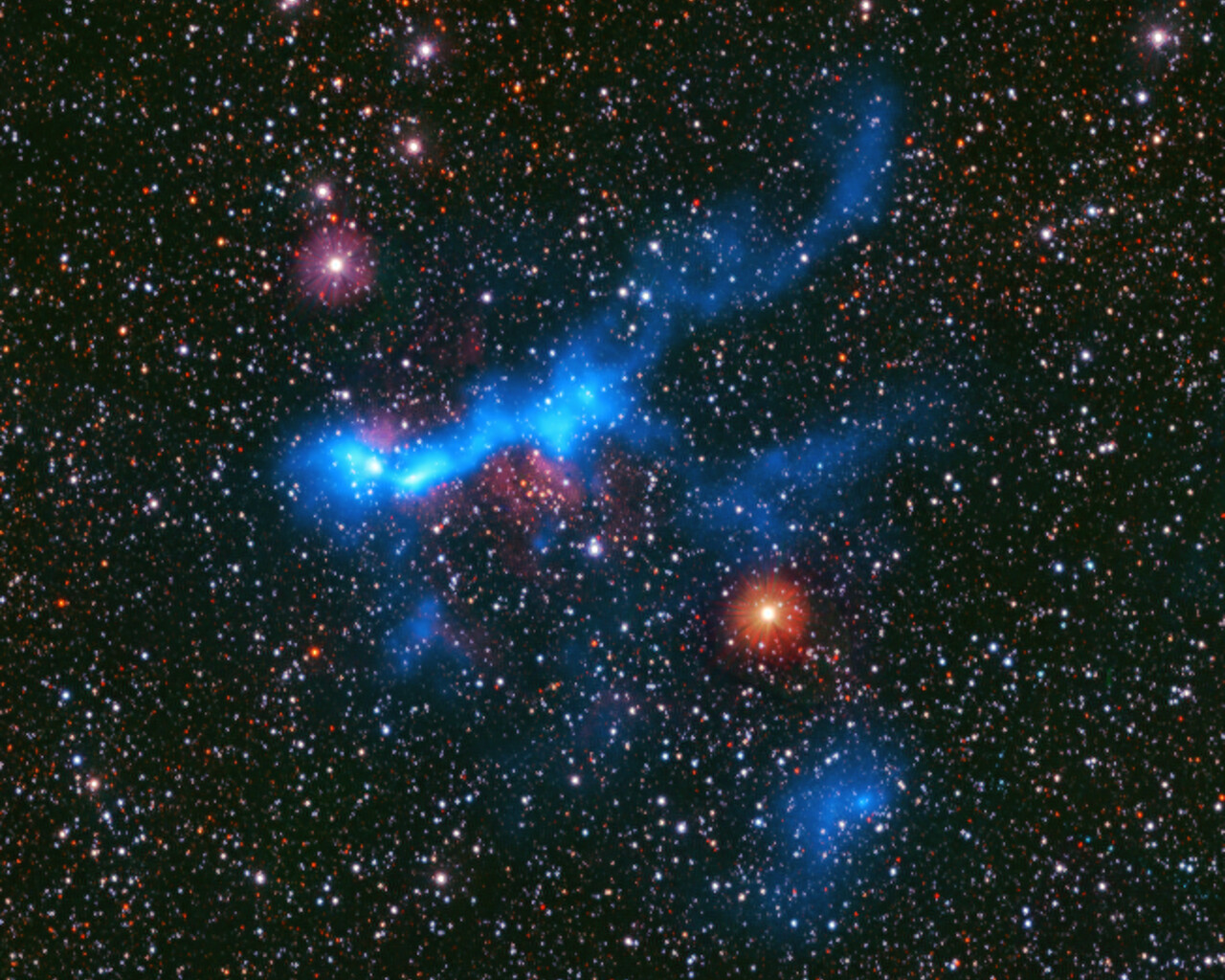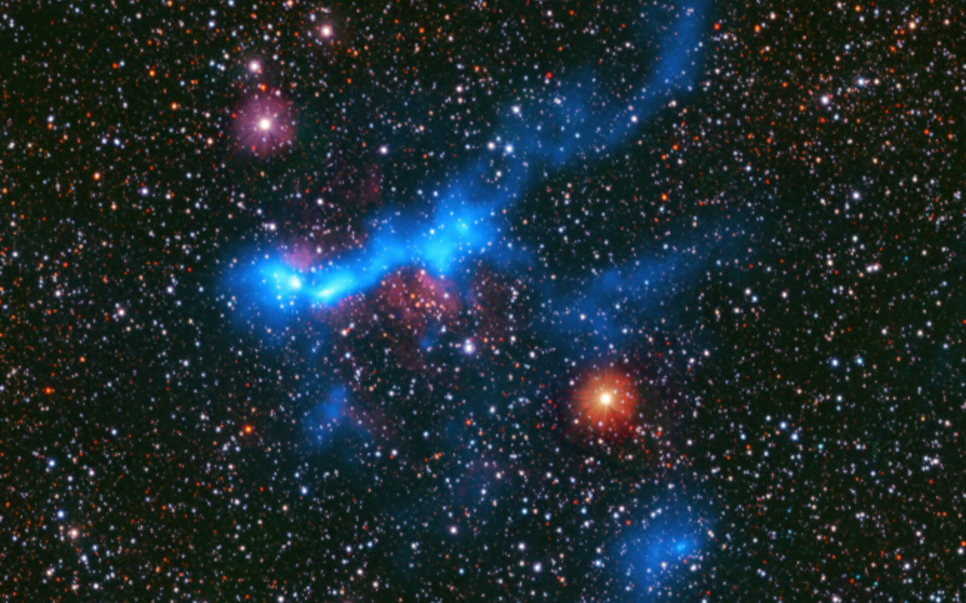In today's Picture of the Week, we’re looking at GAL316, one of the many stellar nurseries a team of astronomers observed to answer this question. This region is part of a survey called CAFFEINE – an astronomer’s best friend – carried out using the ArTéMiS camera at the Atacama Pathfinder Experiment (APEX), a radio-telescope in the Chajnantor plateau. Now operated by the Max Planck Institute for Radio Astronomy, this telescope captures the faint glow of cold gas clouds, seen here as a blue glow. This glow has been overlaid on a starry background captured with ESO’s VISTA telescope.
