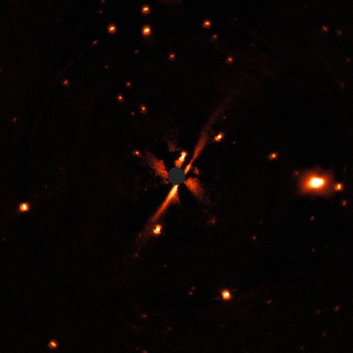 Il disco si estende da sinistra in basso verso a destra in alto. La regione centrale, in grigio, indica la zona in cui la luce della stella è stata mascherata.