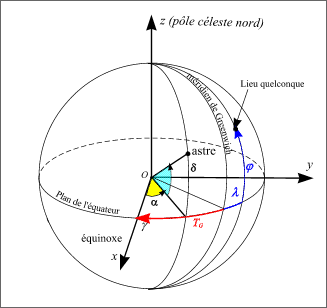 - Following the movement of the Earth's rotation axis (precession and nutation), the origin Ox of the equatorial reference frame varies with time.
