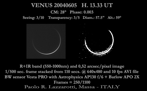 Paolo R. Lazzarotti Astrophysics AP130 f/6 telescope with 2x Barlow APO BW sensor Vesta PRO [Composite of 600 frames] More images at this site June 6, 2004, 11:07 UT Massa, Italy |