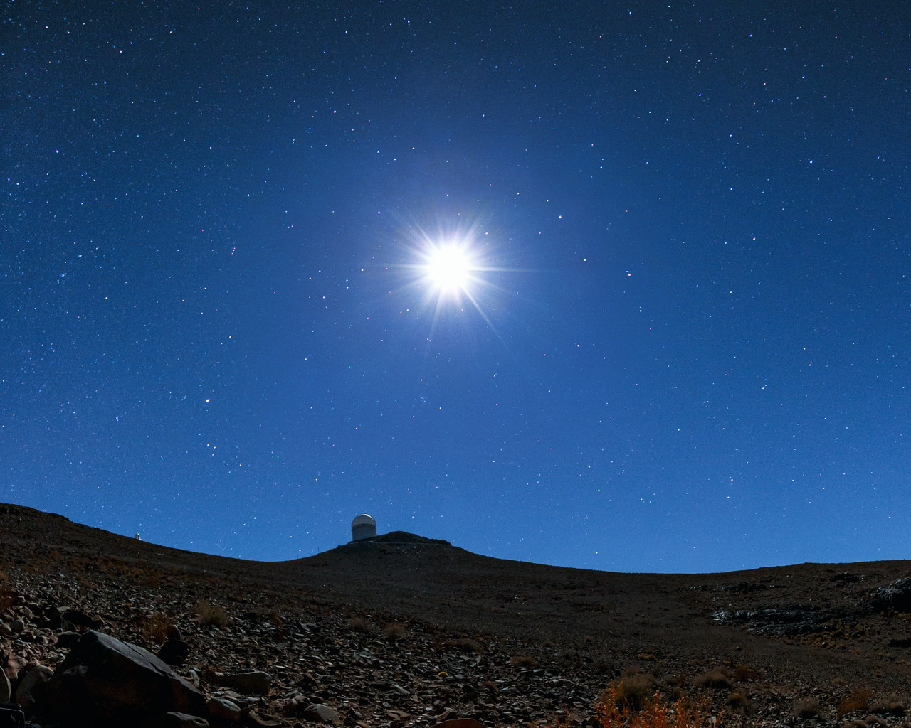 Zdjęcie pokazuje 3,6-metrowy teleskop ESO, połozony w Obserwatorium La Silla w Chile. Nocne niebo nad głową jest zdominowane przez Księżyc, który świeci tak jasno, że w pełni rozświetla scenę.