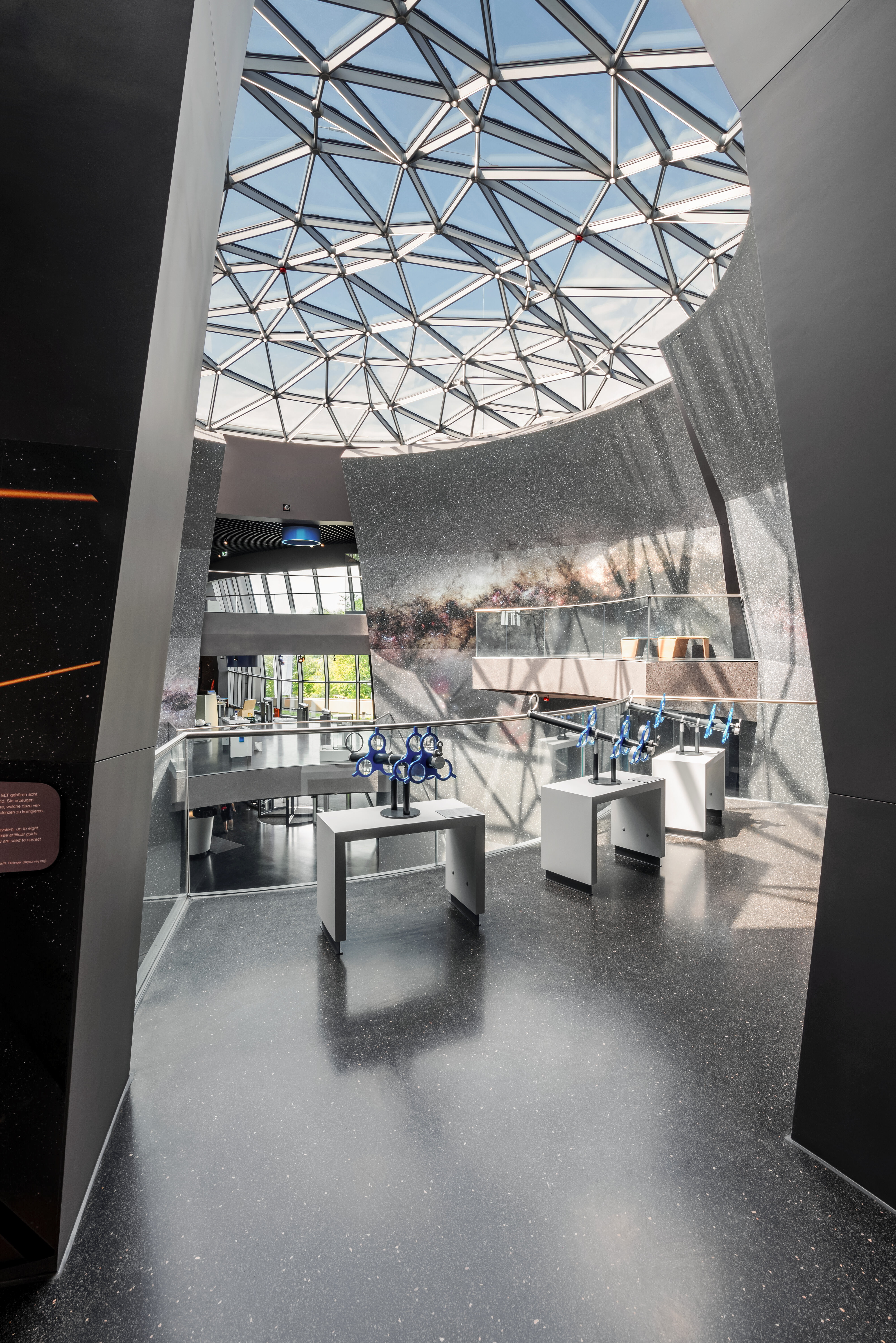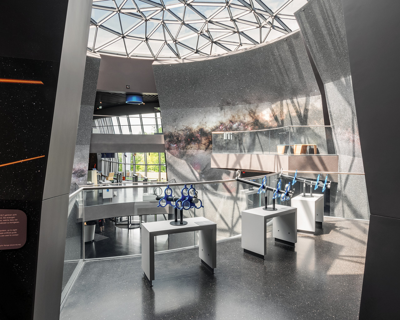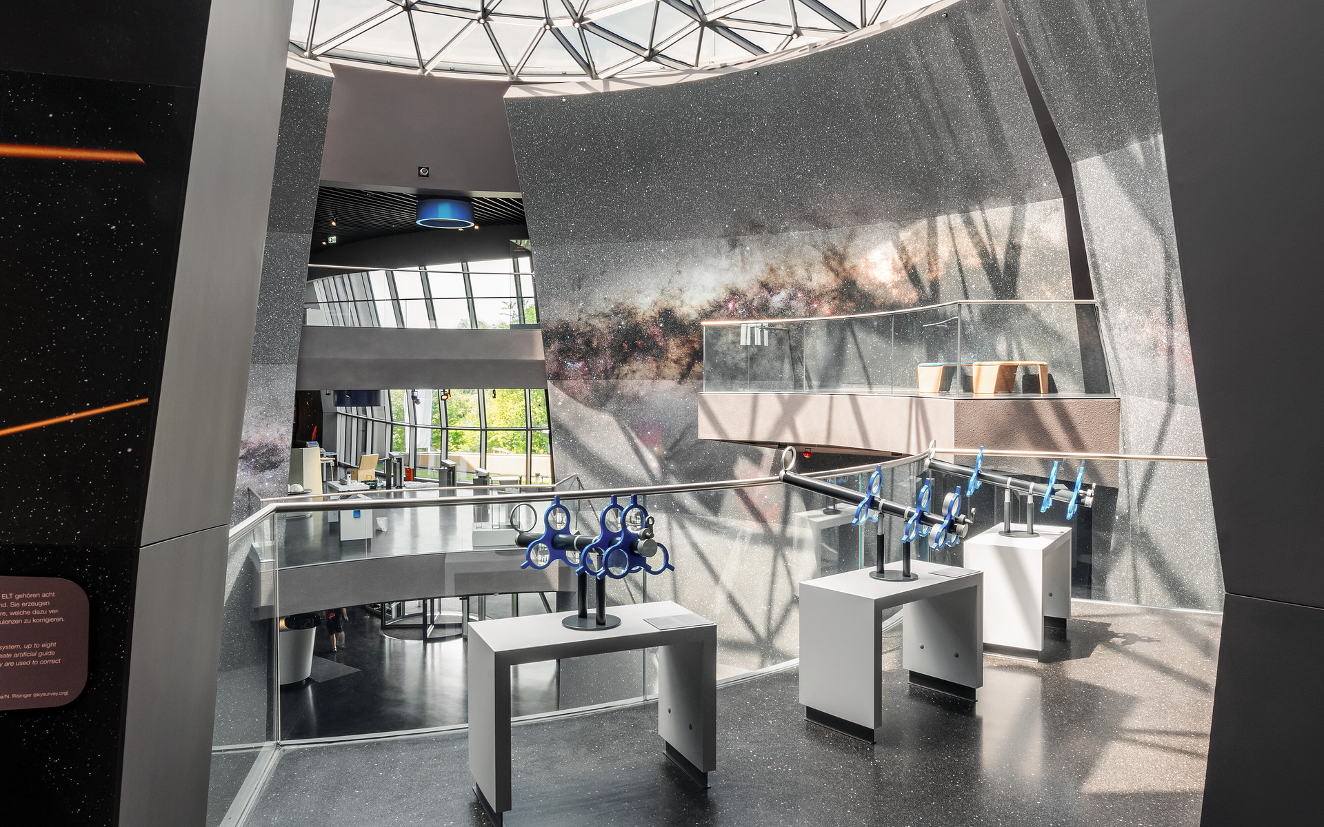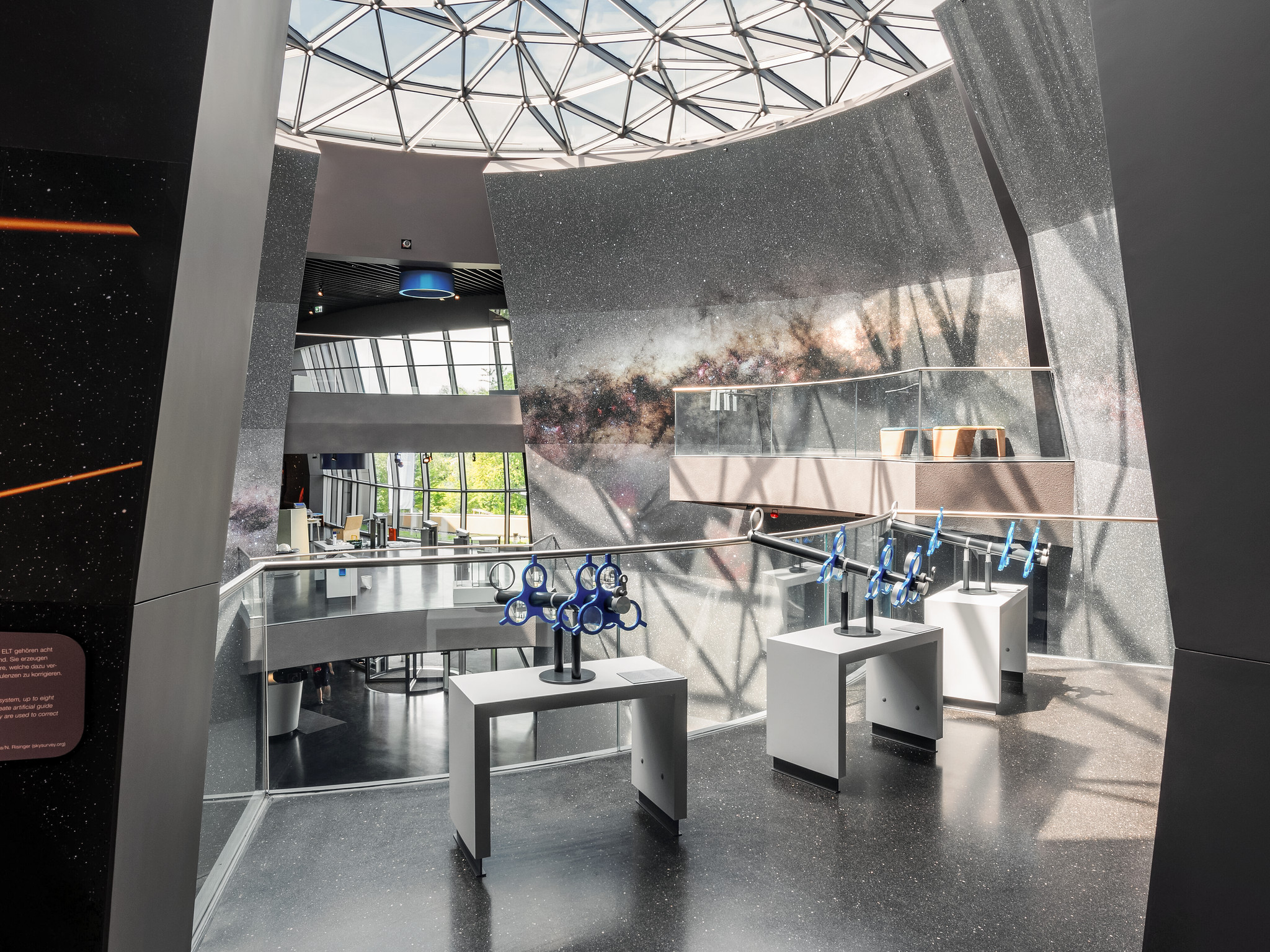 A view into 'The Void', the large sphere-shaped atrium inside ESO Supernova. In the foreground are three stations that allow visitors to arrange lenses in order to 'build' their own Keplerian and Gallilean telescopes. These telescopes can then be used to look out into The Void, especially images of the night sky printed on the curving walls.