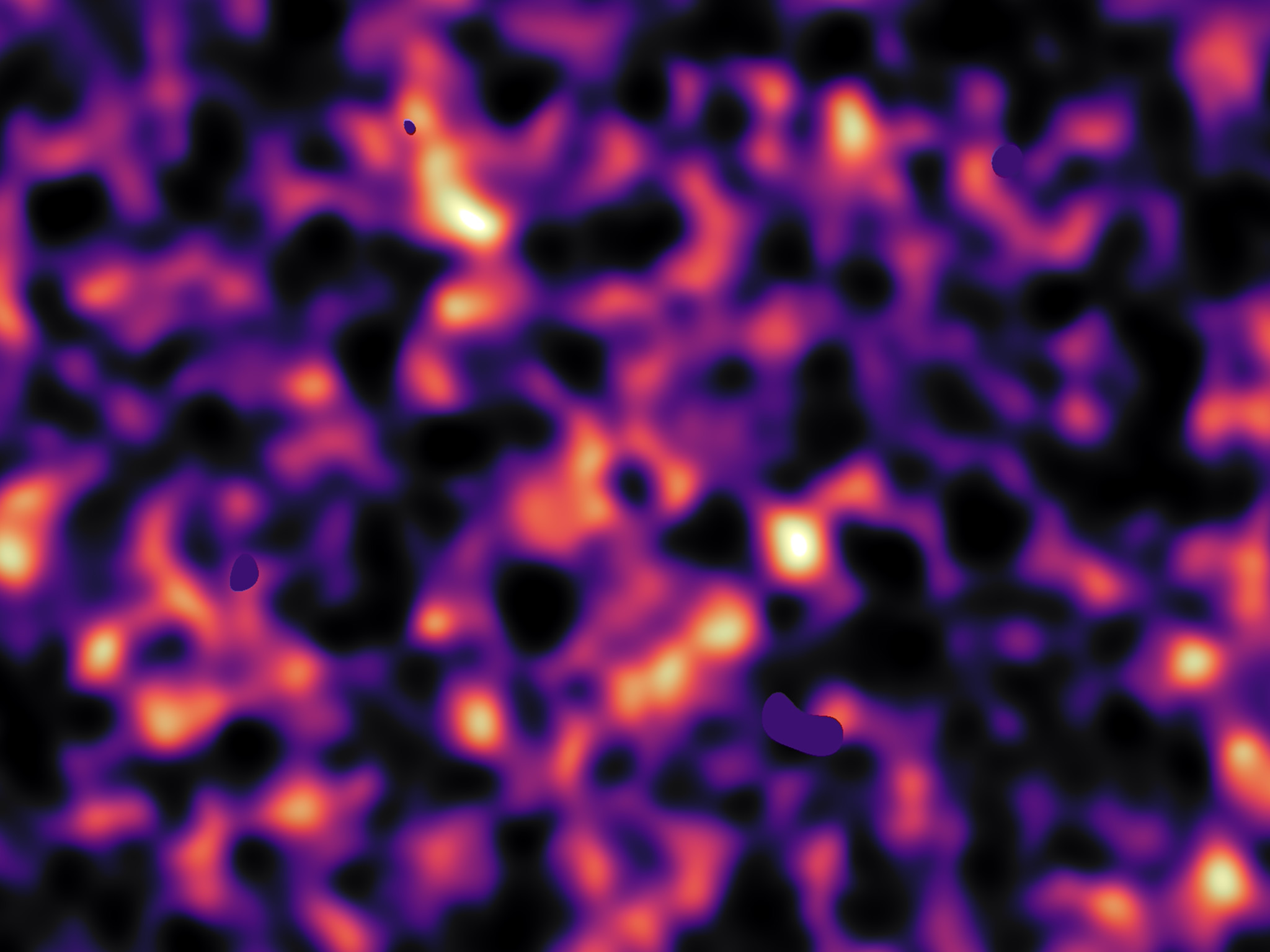 Podemos ver na imagem algumas regiões escuras pequenas com fronteiras pronunciadas, que correspondem à localização de estrelas brilhantes e outros objetos próximos que se encontravam no trajeto da radiação emitida pelas galáxias mais distantes e que foram, por isso, retiradas destes mapas, já que nestas zonas não podemos medir nenhum sinal de lente gravitacional fraca.