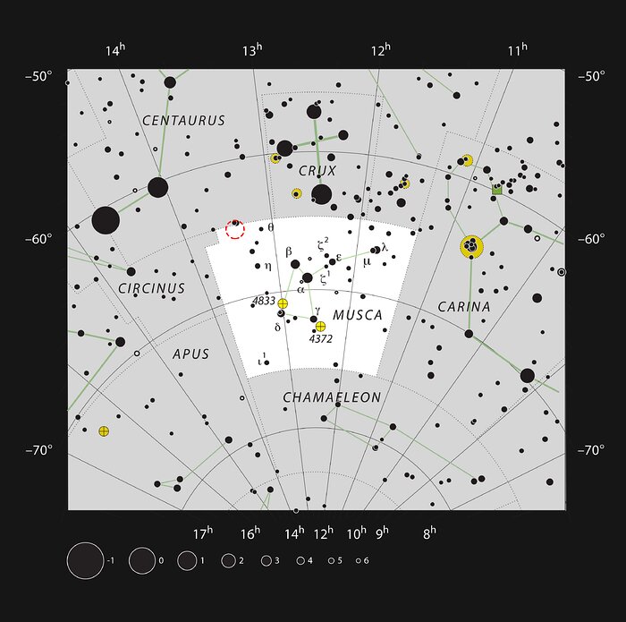 Este mapa mostra a localização do sistema TYC 8998-760-1 na constelação da Mosca, onde estão assinaladas a maioria das estrelas visíveis a olho nu sob boas condições de observação. O sistema propriamente dito encontra-se marcado com um círculo vermelho.