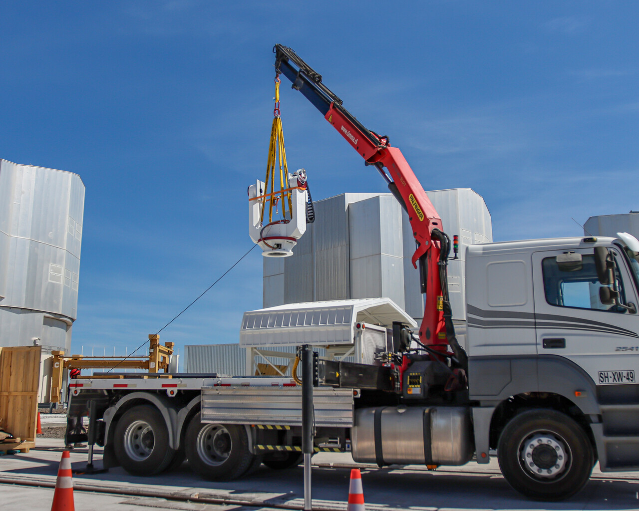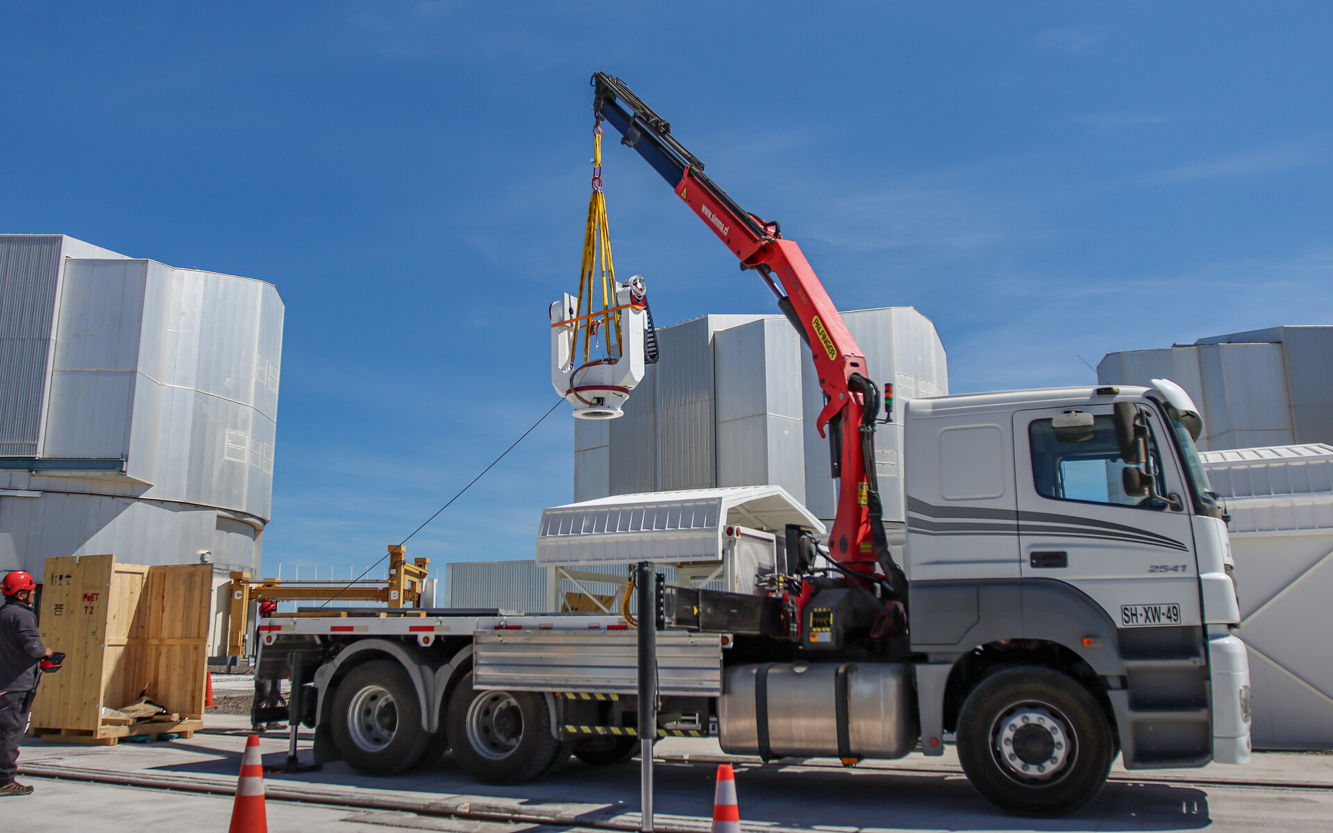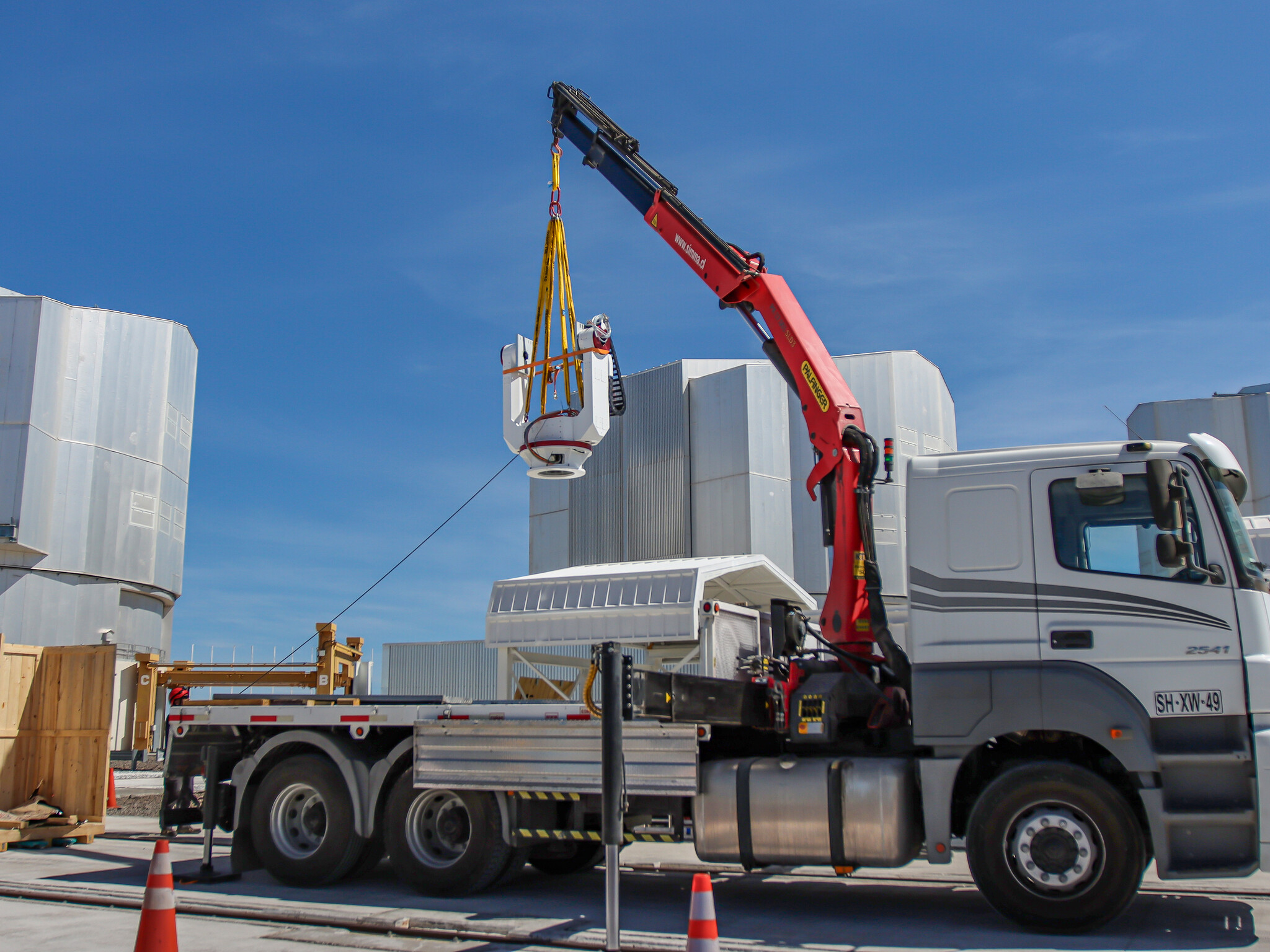Vemos, nesta imagem, a base em forma de forquilha que irá suportar o telescópio principal do PoET a ser colocada dentro da cúpula do telescópio – a pequena casinha branca atrás do camião. Esta base permitirá que o telescópio aponte para o Sol e o acompanhe no seu movimento ao longo do céu. As enormes cúpulas de três dos quatro Telescópios Principais que compõem o Very Large Telescope do ESO podem também ser vistas na imagem.