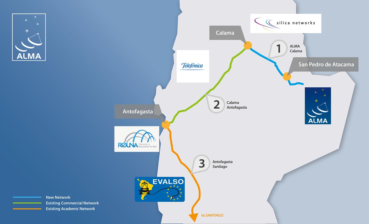 El nuevo sistema implicará la instalación de cerca de 150 kilómetros de fibra óptica entre el observatorio radio astronómico –ubicado a 34 kilómetros de San Pedro de Atacama- y la ciudad de Calama. Desde este punto se conectará a través de una estructura de comunicación ya existente a la red académica REUNA en Antofagasta, y desde allí hasta las oficinas de ALMA en Santiago a través de la infraestructura creada en 2010 por EVALSO, un proyecto cofinanciado por la Comisión Europea, que provee conectividad al observatorio Paranal de ESO , entre otros, y que es operada por REUNA. (see eso1043 for more about EVALSO). El proyecto de la fibra óptica está gestionado por Giorgio Filippi, empleado de ESO que temporalmente presta sus servicios al Joint ALMA Observatory.
