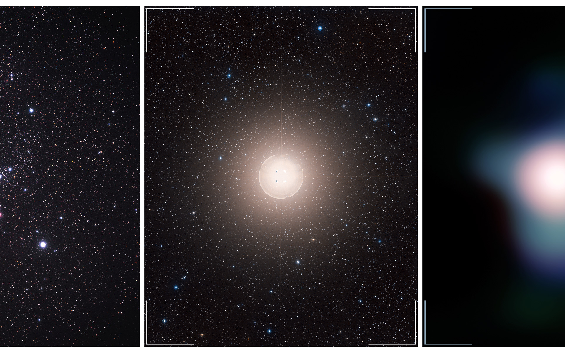 Este collage muestra la constelación Orión en el cielo (Betelgeuse está identificada por el marcador), un acercamiento o zoom hacia Betelgeuse, y la fotografía más nítida jamás tomada de esta estrella súper gigante, que fue obtenida con NACO en el Very Large Telescope de ESO.