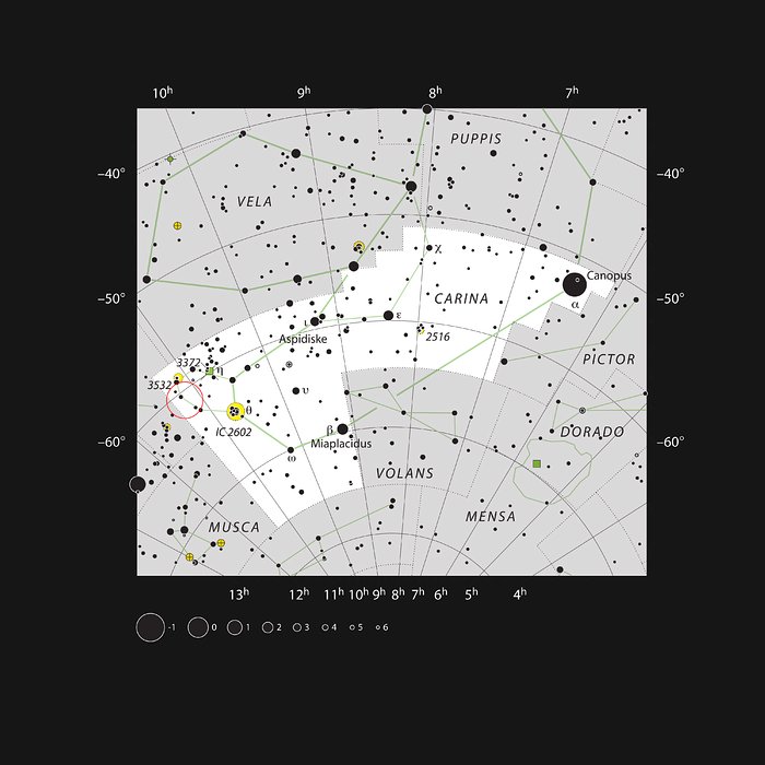 Ce graphe montre la vaste constellation de La Carène, la quille du Navire Argo utilisé par Jason et les Argonautes. La plupart des étoiles visibles à l'œil nu par temps clair figure sur cette image. On voit également l'amas stellaire NGC 3590. Il peut être observé au travers d'un télescope de faibles dimensions sous l'aspect d'un petit ensemble d'étoiles faiblement brillantes dans une région peuplée du sud de la Voie Lactée.
