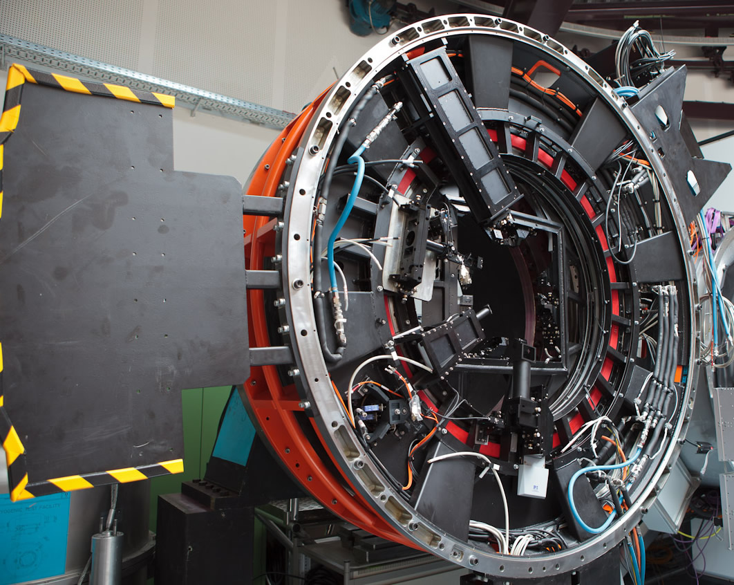 The removal of Hawk-I from its operation location reveals the adaptive optics module, GRAAL. Here, Hawk-I's spherical vessel and equipments have been discarded, and only its sleeve towards the telescope's adapter has been kept.